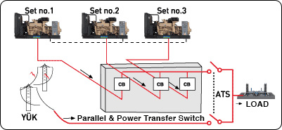 Şebekeye yedek, tek jeneratör ve kesintisiz geçiş sistemi veya şebekeyle paralel çalışan tek jeneratör.